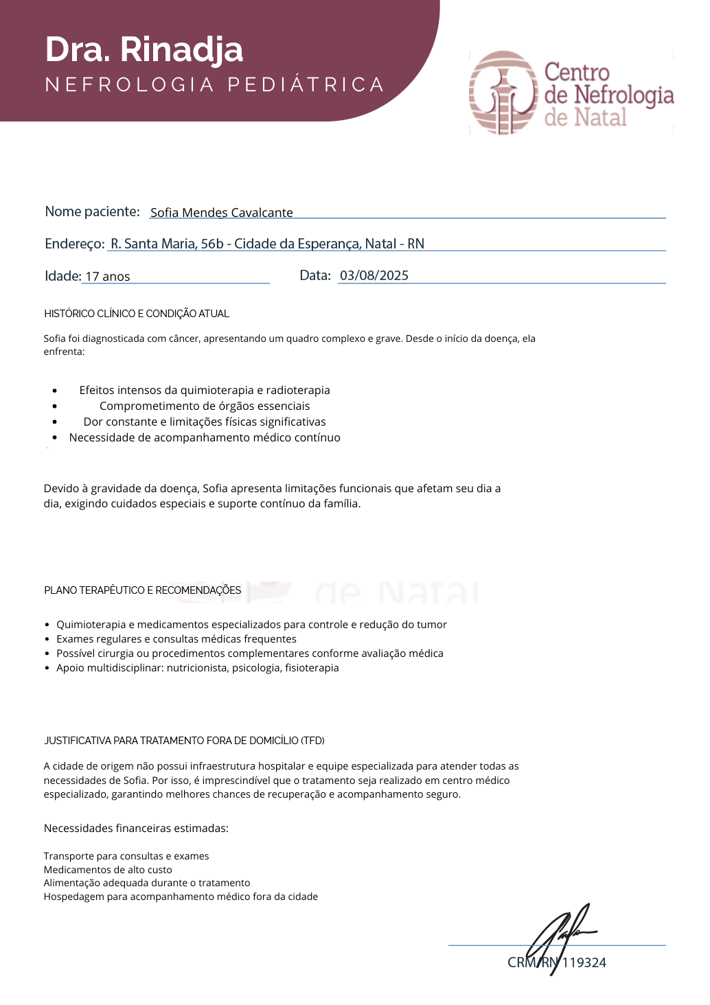 "O SUS cobre parte do tratamento, mas para que eu possa recebê-lo, preciso me mudar. Minha família não consegue arcar com todas as despesas, e cada ajuda faz uma diferença enorme: